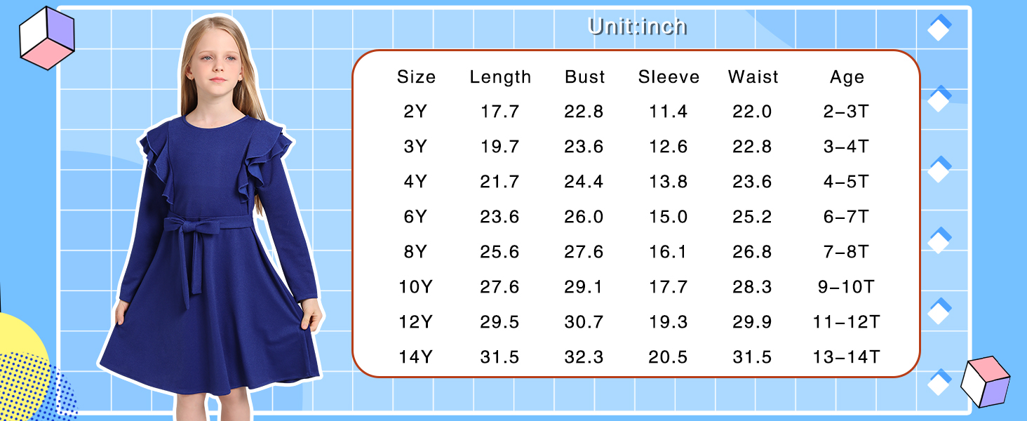 Tamaño: este vestido de otoño invierno para niñas pequeñas es adecuado para 2-3 años, 3-4 años, 4-5 años, 6-7 años, 7-8 años, 9-10 años, 11-12 años, 13-14 años. . Y puedes elegir de la tabla de tallas (todas las medidas son medidas manuales, el rango de error es de 2-3 cm).