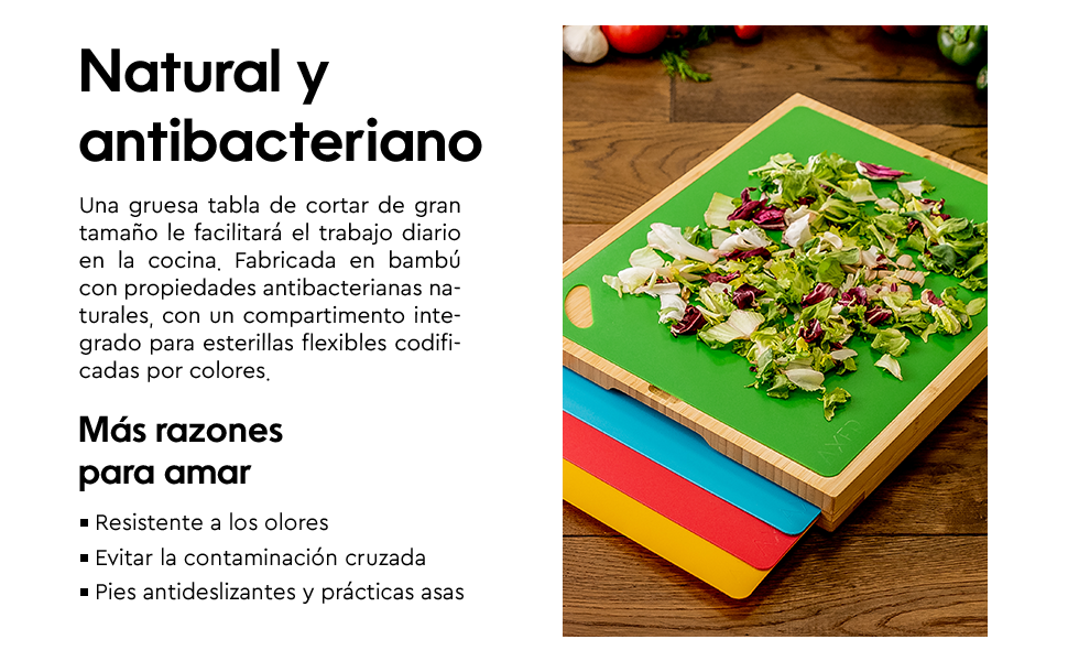 TABLAS DE PICAR DE PLÁSTICO – La tabla de cortar tiene un orificio especial en el que hay 4 tablas de picar finas, con un código de colores. Utilizándolas sobre la tabla de madera evitas el crecimiento de moho, bacterias y la contaminación cruzada.